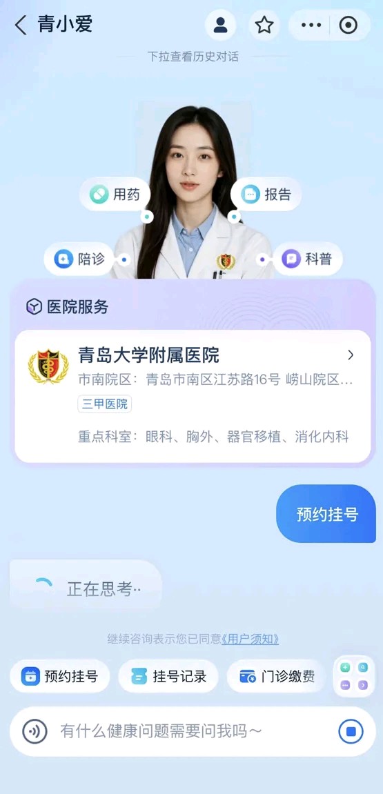 据悉,“青小爱”具备诊前智能导诊功能,可以精准匹配科室与专家,挂号更高效“青小爱”智慧就医AI助理打破传统导诊局限,患者只需提供症状及持续时间或体征等,即可结合医院科室设置,推荐适配科室与专家,并同步说明推荐理由,直接弹出号源链接,实现“一键挂号”。