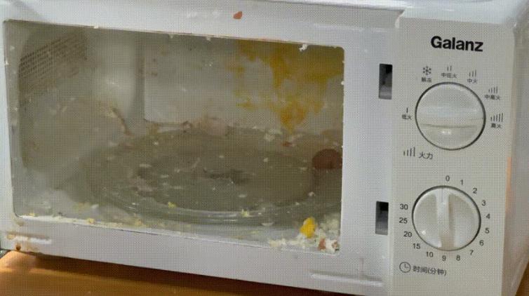 微波炉顶部张贴的使用警告也明确提示“勿在炉内煮带壳蛋,以防爆裂损坏炉门。”