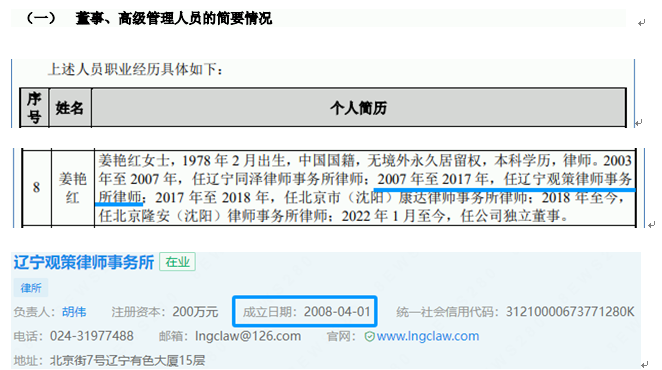 高管履历的时间出入进一步引发对公司内控的质疑。招股书显示独立董事姜艳红2007年至2017年任职于辽宁观策律师事务所,但企查查等平台查询的工商信息显示,该律所实际成立于2008年4月1日,履历起始时间早于律所成立时间近一年。