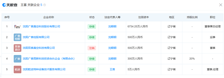 除数据矛盾外,广泰真空在信息披露完整性与内部治理方面也暴露出短板。高管关联关系披露不完整成为突出问题。据天眼查信息显示,广泰真空董事总经理王喜同时担任沈阳乾进特种设备技术服务有限公司董事、经理,但该兼职情况未在招股书中提及。