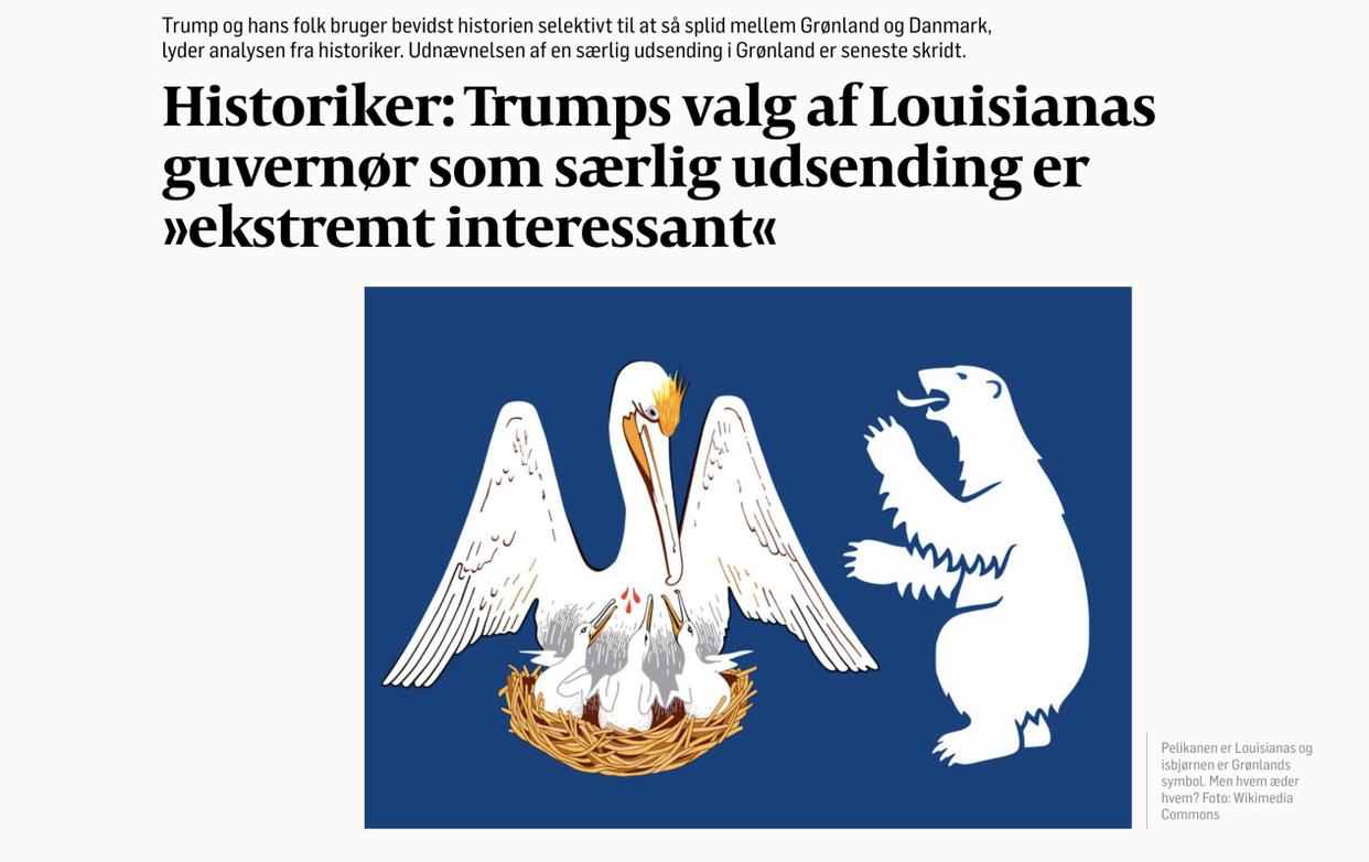 丹麦舆论普遍认为,此次任命路易斯安那州州长出任特使并非偶然,而是经过精心设计的政治安排。该人选所蕴含的历史象征意义被视为一种明确的政治信号,暗示相关领土扩张意图,具有明显的象征性和挑衅意味。