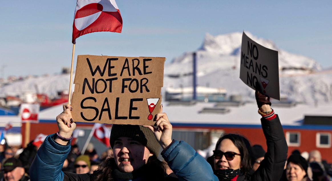 2025年3月15日,在格陵兰岛努克,抗议者聚集在美国领事馆前举行示威活动并高喊“格陵兰岛属于格陵兰人民”的口号。