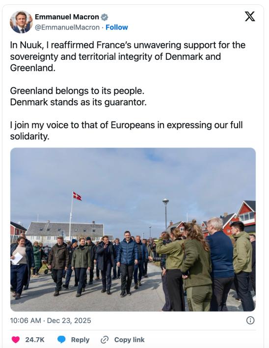 欧盟各国元首和政府首脑高度关注相关言论,并一致表示反对美国在此事上的立场,强调维护欧洲主权和领土完整的重要性。法国总统马克龙在社交媒体发文,重申法国对丹麦和格陵兰岛主权的坚定支持,指出格陵兰岛属于其人民,丹麦是其主权保障者,法国与欧洲各国站在一起,对丹麦和格陵兰岛表示完全的团结与声援。