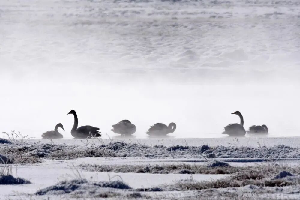 几只天鹅在新疆和静县巴音布鲁克湿地嬉戏(2016年12月17日摄)。新华社发(确·胡热 摄)