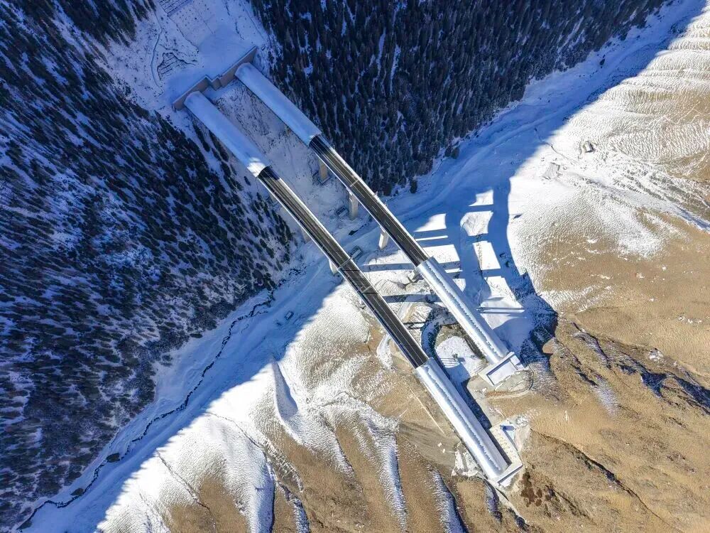 乌尉高速公路后峡隧道(左)与哈熊沟隧道相连(2025年12月23日摄)。新华社记者 胡虎虎 摄