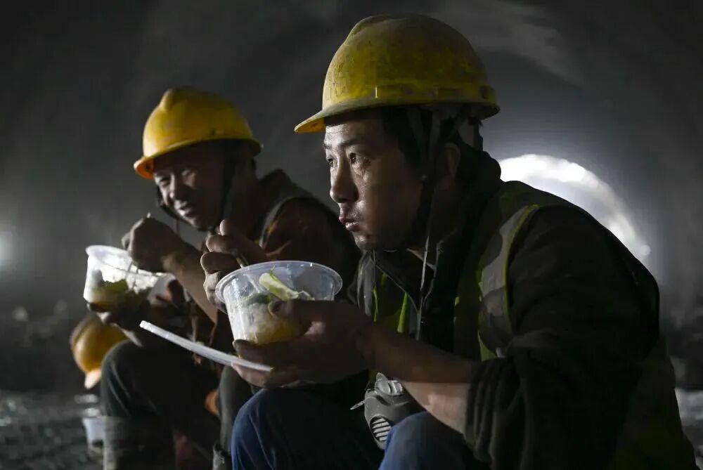 参与天山胜利隧道建设的工人杨林(右)与工友在施工现场吃午饭(2024年12月25日摄)。新华社记者 胡虎虎 摄