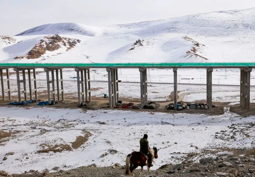 在新疆和静县,牧民骑马从在建的乌尉高速公路附近经过(2024年12月30日摄)。新华社记者 王菲 摄