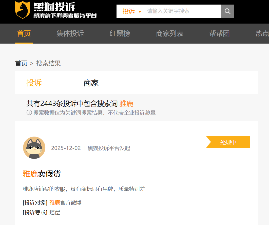 黑猫投诉平台数据显示,仅“雅鹿”品牌相关投诉就超2400条,涉及“高仿假货”“做工粗糙”等问题。更有消费者发现所购衣物 出现“水洗标与吊牌品牌不一致”,甚至撕下表层商标后露出另一品牌的叠标乱象。