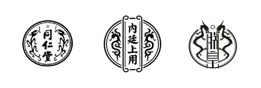 左:“同仁堂双龙商标”;中:“内廷上用”商标;右:“朕皇”商标