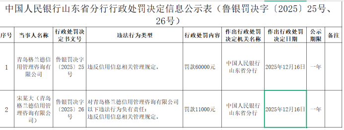 12月22日,中国人民银行山东省分行官网披露的行政处罚决定书显示,青岛格兰德信用管理咨询有限公司因违反信用信息管理相关规定被罚款6万元。同时,宋某大(青岛格兰德信用管理咨询有限公司)因对上述违法行为负有责任被罚款1.1万元。