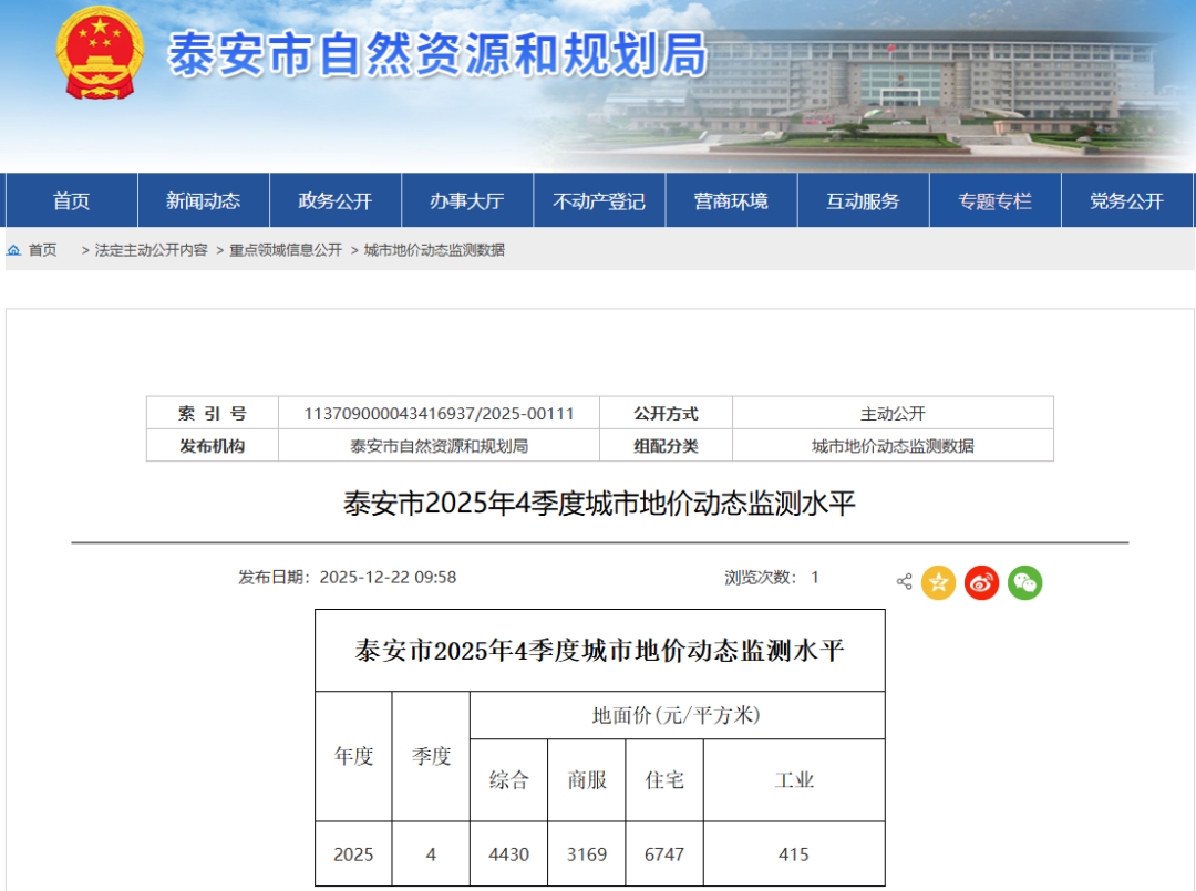 近日,泰安市自然资源和规划局网站发布泰安市2025年4季度城市地价动态监测水平,详情——