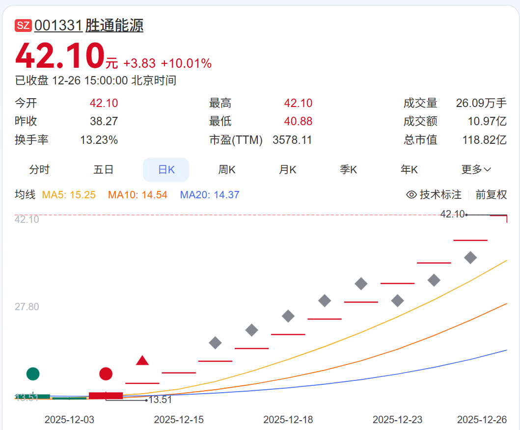 12月26日,胜通能源(001331.SZ)再度涨停,报收于42.1元/股,全天换手率15.54%,成交量26.09万手,最新总市值118.8亿元。至此,该股已连收11个涨停板。此前,胜通能源表示,如未来股票价格进一步上涨,可能向深交所申请停牌核查。