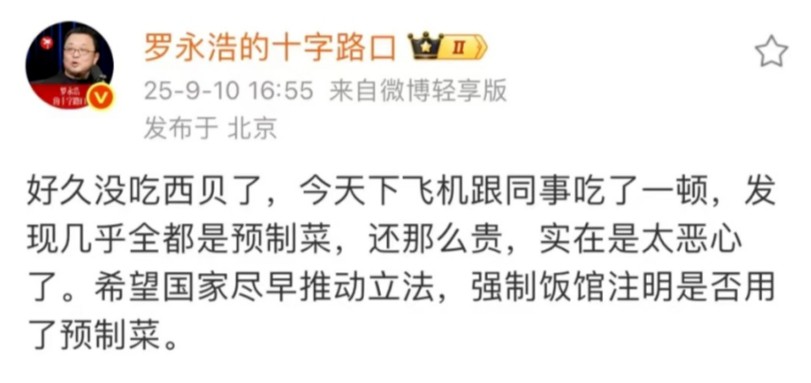 而罗永浩在西贝致歉后选择收手,一句“期待预制菜法规尽快出台”,让这场风波回归“推动行业透明化”的初衷。
