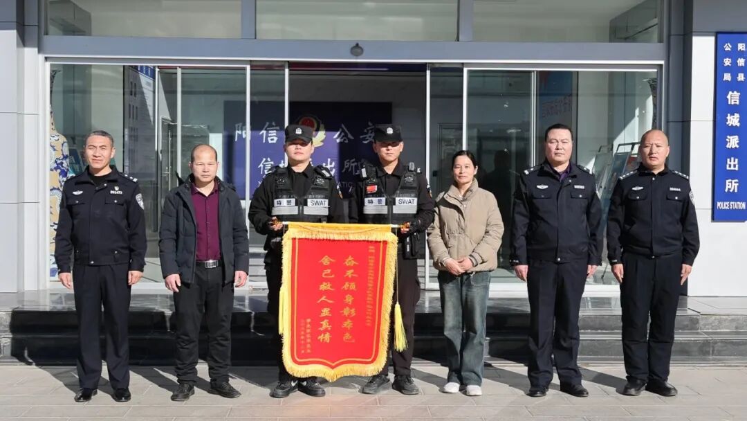 12月25日,获救学生的家属专程来到阳信县公安局特巡警大队,将一面锦旗送到三名队员手中,含泪表达感激之情。