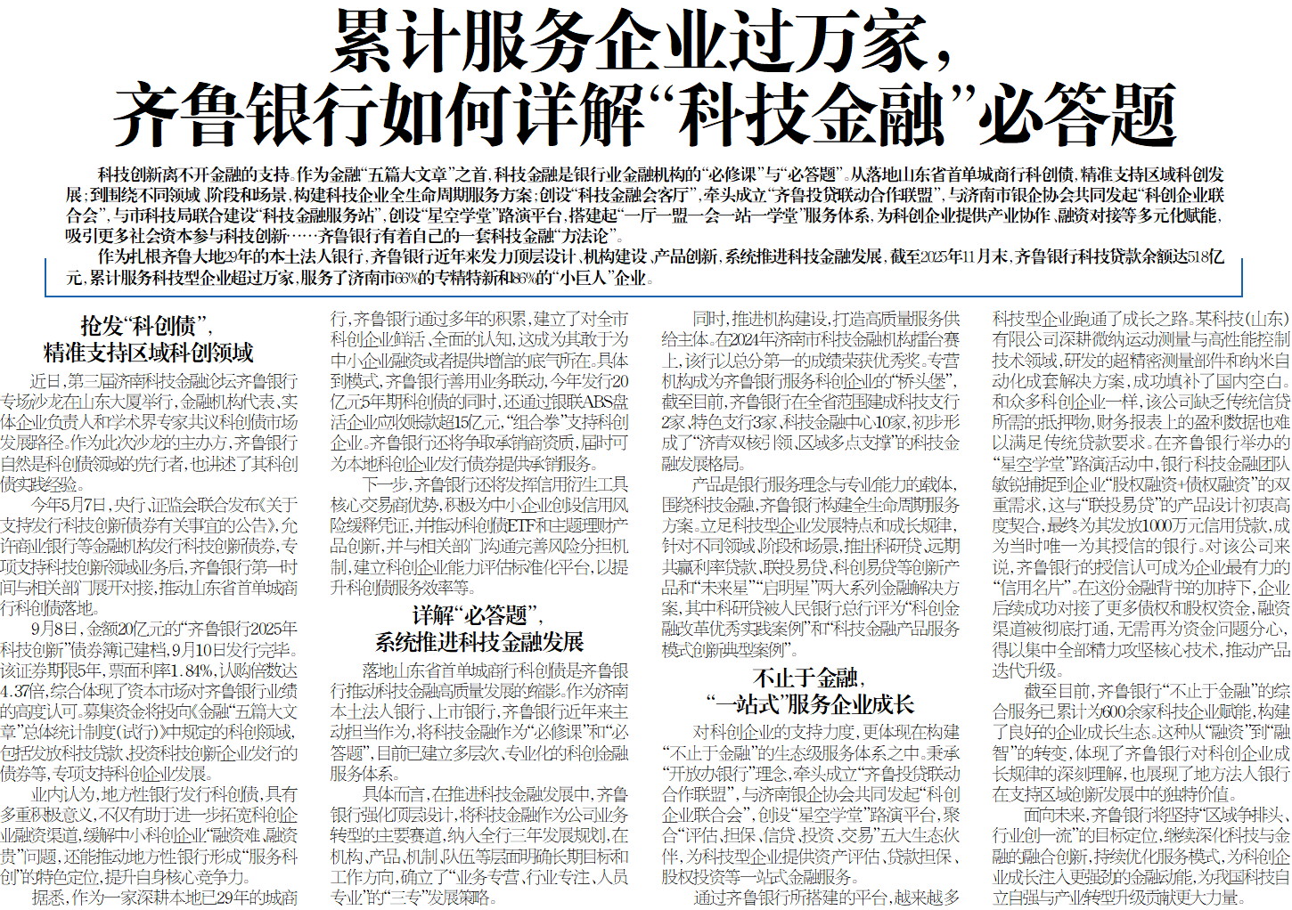 作为扎根齐鲁大地29年的本土法人银行,齐鲁银行近年来发力顶层设计、机构建设、产品创新,系统推进科技金融发展,截至2025年11月末,齐鲁银行科技贷款余额达518亿元,累计服务科技型企业超过万家,服务了济南市66%的专精特新和86%的“小巨人”企业。