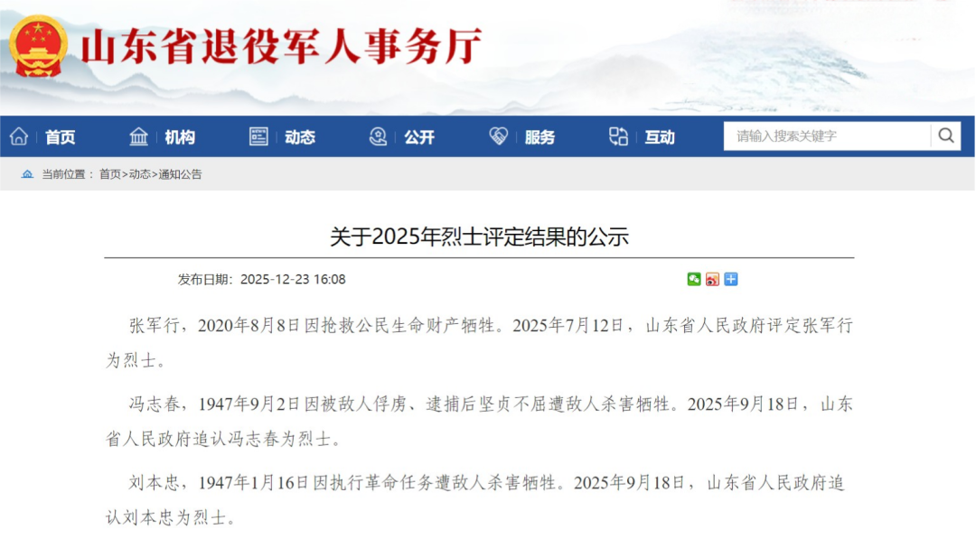 近日,山东省退役军人事务厅发布《关于2025年烈士评定结果的公示》,张军行、冯志春、刘本忠3名同志拟评定为烈士。