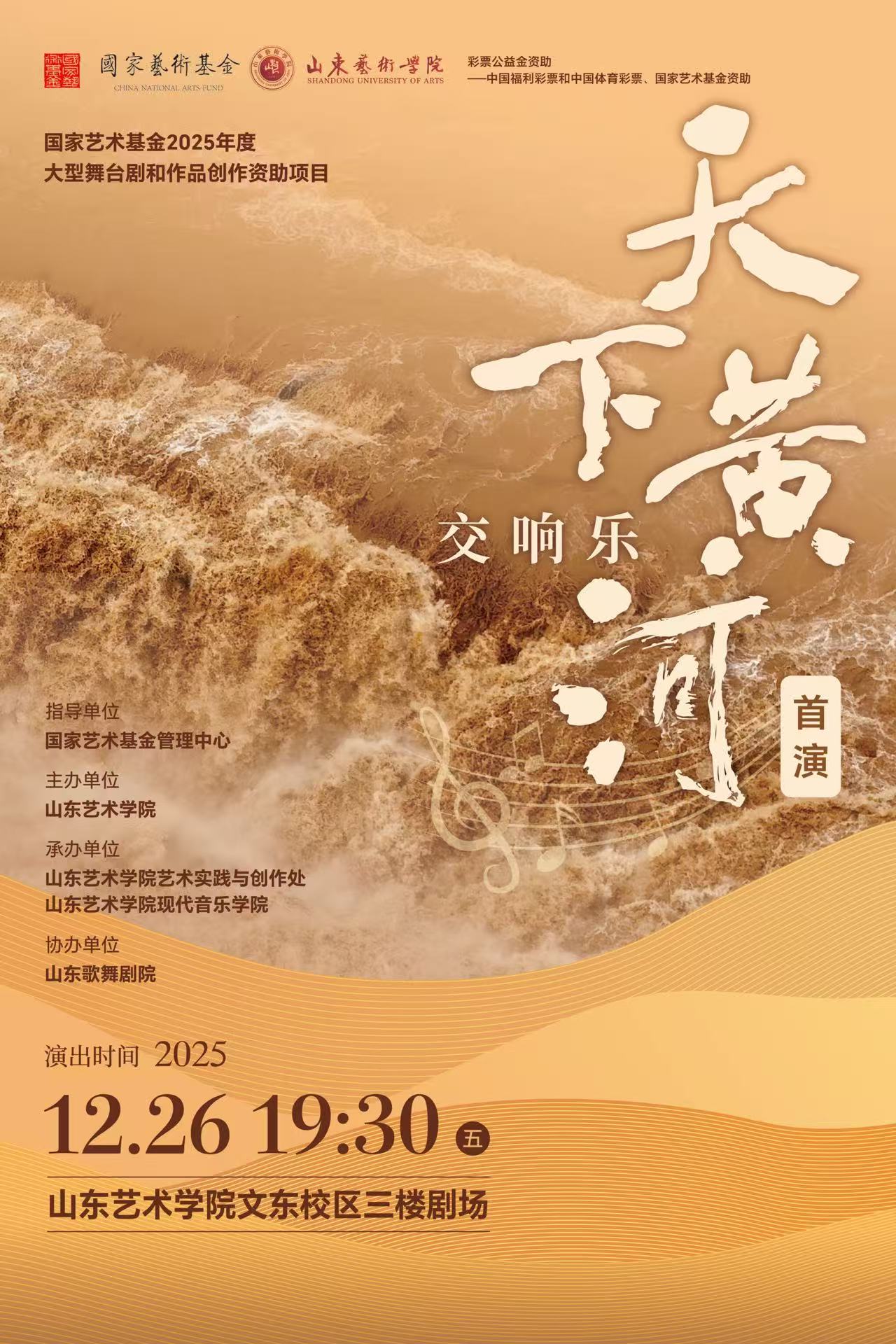 12月26日,国家艺术基金2025年度大型舞台剧和作品创作资助项目——交响乐《天下黄河》首演发布会于山东艺术学院文东校区举办,该作品的震撼首演也将在校区艺术剧场三楼大剧场拉开帷幕。