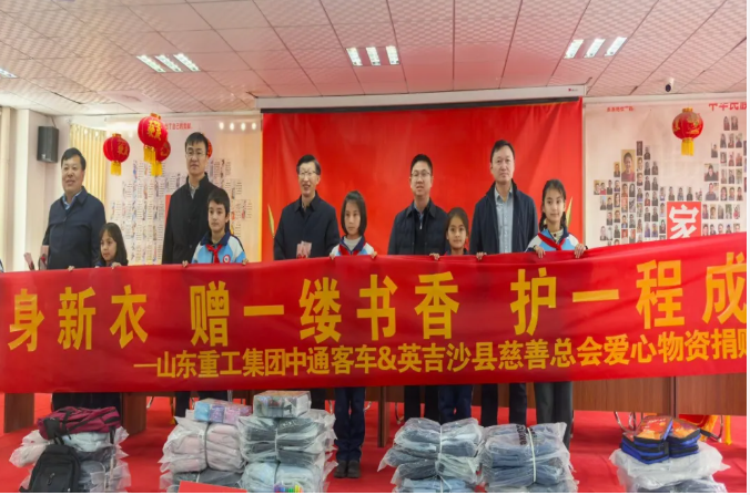 12月23日,中通客车股份有限公司爱心物资捐赠仪式在新疆英吉沙县库木艾日克村举行。中通客车通过县慈善总会,向克孜勒乡8村小学捐赠了620套爱心物资,为边疆学子送去冬日的关怀。英吉沙县政府副县长邓永翔,济宁援疆指挥部相关负责同志出席活动。