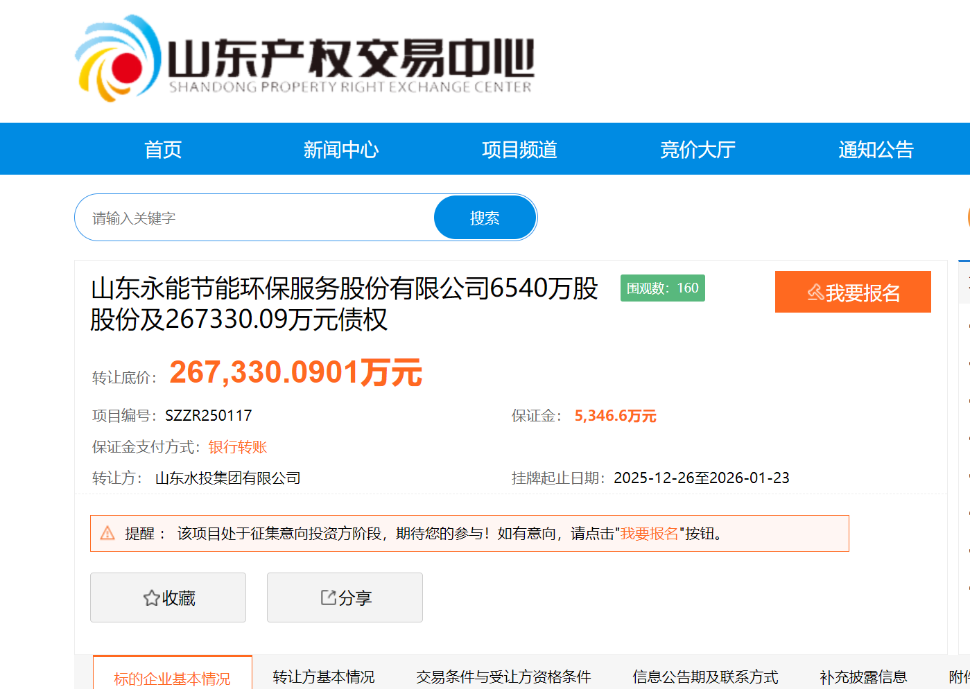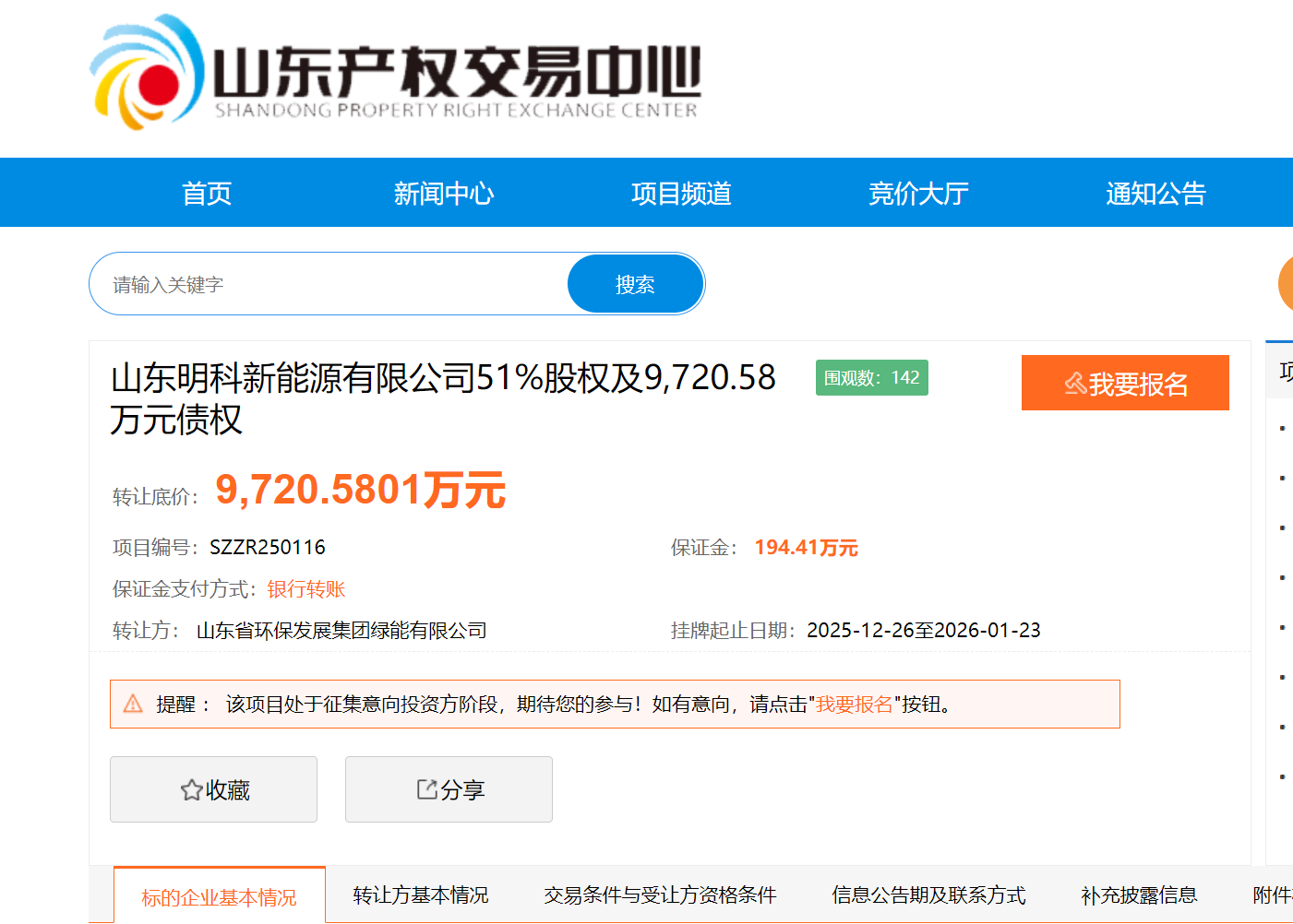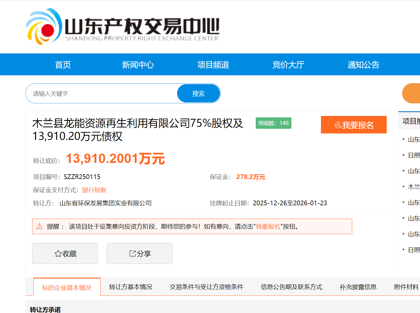其中,山东水投集团有限公司(下称“山东水投”)持有的山东永能节能环保服务股份有限公司(下称“永能环保”)6540万股股份及26.73亿元债权转让底价为26.73亿元,山东省环保发展集团实业有限公司(下称“环保发展实业”)持有的木兰县龙能资源再生利用有限公司(下称“龙能资源”)75%股权及1.39亿元债权转让底价为1.39亿元,山东省环保发展集团绿能有限公司(下称“绿能公司”)持有的山东明科新能源有限公司(下称“明科新能源”)51%股权及9720.58万元债权转让底价为9720.58万元,挂牌起止日期均为2025年12月26日至2026年1月23日。