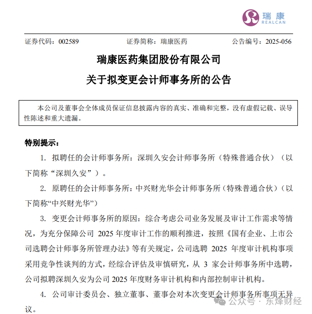 12月25日,烟台上市公司瑞康医药(002589.SH)发布拟变更会计师事务所的公告,宣布拟聘用深圳久安会计师事务所作为2025年度财务审计机构和内部控制审计机构。