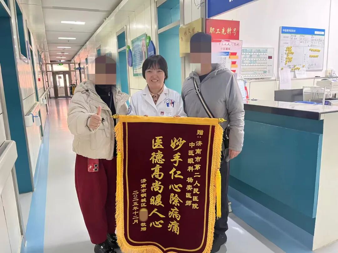 近日,济南市眼科医院(济南市第二人民医院)收到了一面写着“妙手仁心除病痛,医德高尚暖人心”的锦旗。58岁的尹大爷和老伴满是感激的将锦旗送到眼十科(中医眼科)诊室主治医师杨奕医师的手上。