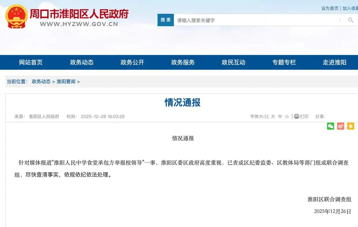 河南周口淮阳区联合调查组12月26日发布情况通报:针对媒体报道“淮阳人民中学食堂承包方举报校领导”一事,淮阳区委区政府高度重视,已责成区纪委监委、区教体局等部门组成联合调查组,尽快查清事实,依规依纪依法处理。