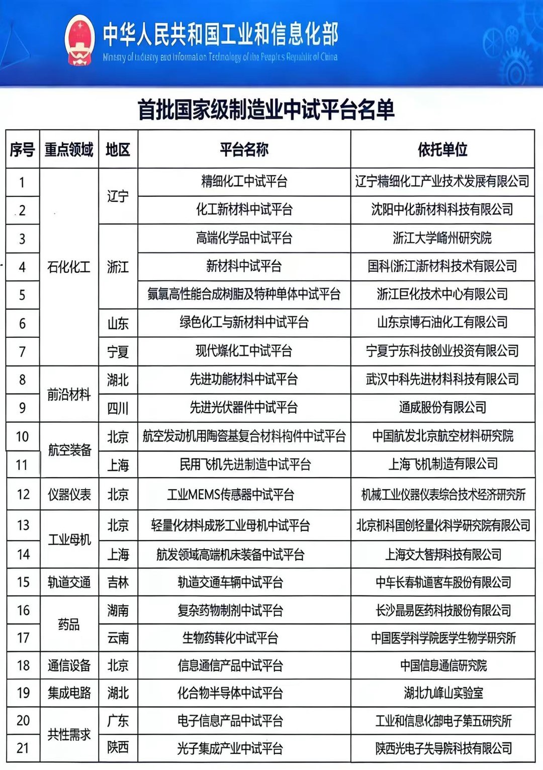 近日,工业和信息化部在辽宁省盘锦市召开制造业中试创新发展座谈会,同期公布了首批21家国家级制造业中试平台名单。