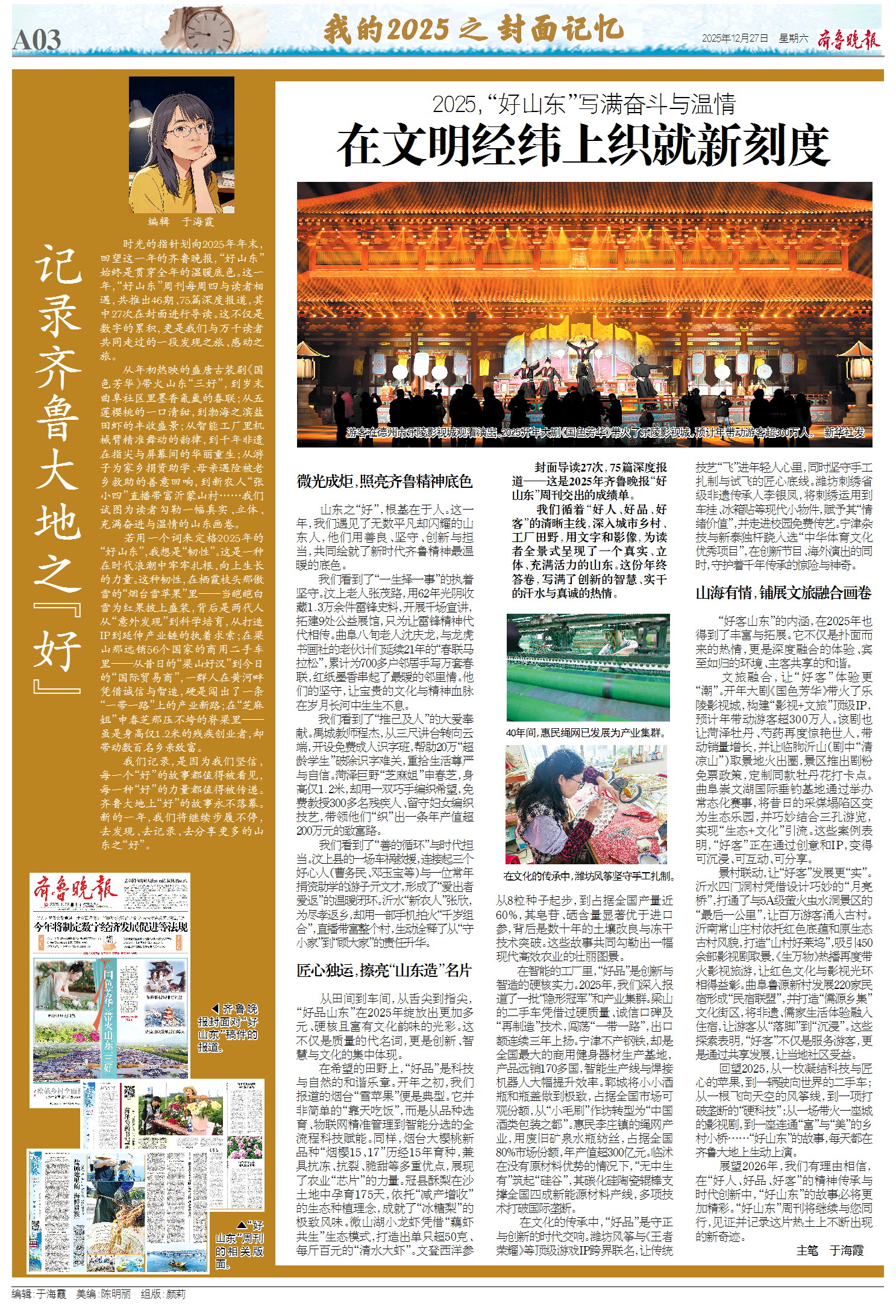 时光的指针划向2025年年末,回望这一年的齐鲁晚报,“好山东”始终是贯穿全年的温暖底色。这一年,“好山东”周刊每周四与读者相遇,共推出46期、75篇深度报道,其中27次在封面进行导读。这不仅是数字的累积,更是我们与万千读者共同走过的一段发现之旅、感动之旅。