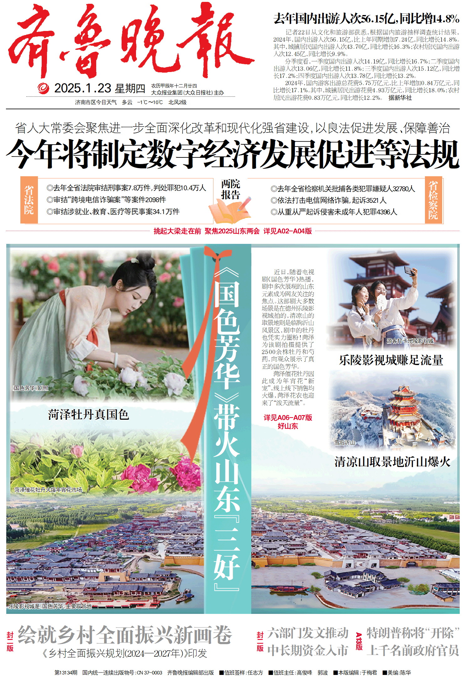 从年初热映的盛唐古装剧《国色芳华》带火山东“三好”,到岁末曲阜社区里墨香氤氲的春联;从五莲樱桃的一口清甜,到渤海之滨盐田虾的丰收盛景;从智能工厂里机械臂精准舞动的韵律,到千年非遗在指尖与屏幕间的华丽重生;从游子为家乡捐资助学、母亲遇险被老乡救助的善意回响,到新农人“张小四”直播带富沂蒙山村……我们试图为读者勾勒一幅真实、立体、充满奋进与温情的山东画卷。