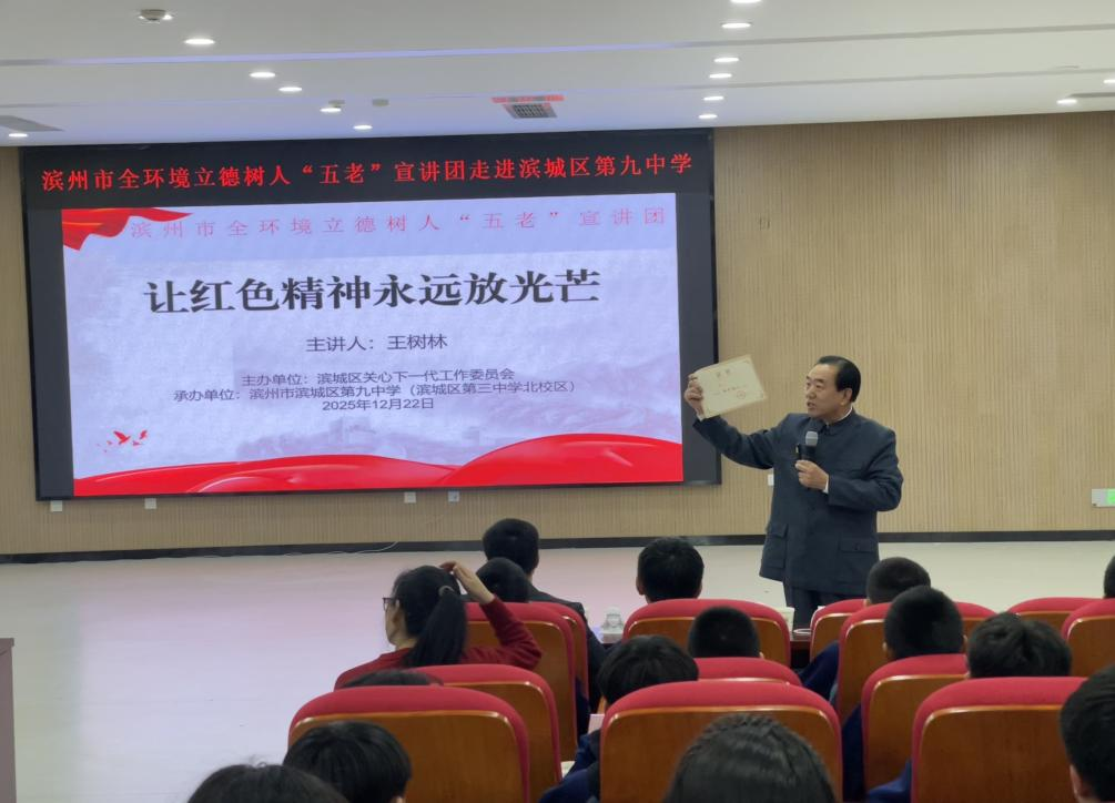 为深入推进全环境立德树人工作,厚植青少年红色基因,涵养赤诚爱国情怀,12月22日,滨州市全环境立德树人“五老”宣讲团走进滨城区第九中学(滨城区第三中学北校区),为全校师生送来一堂生动鲜活的红色思政课。活动伊始,学校卜祥柱副校长登台致开场词,并隆重介绍莅临我校的宣讲嘉宾。随后,山东省党史宣讲名家、滨州市“五史”宣讲团副团长王树林,以“让红色精神永放光芒”为主题,结合鲜活史实与深刻感悟,为师生们带来一场浸润心灵、催人奋进的红色教育盛宴。