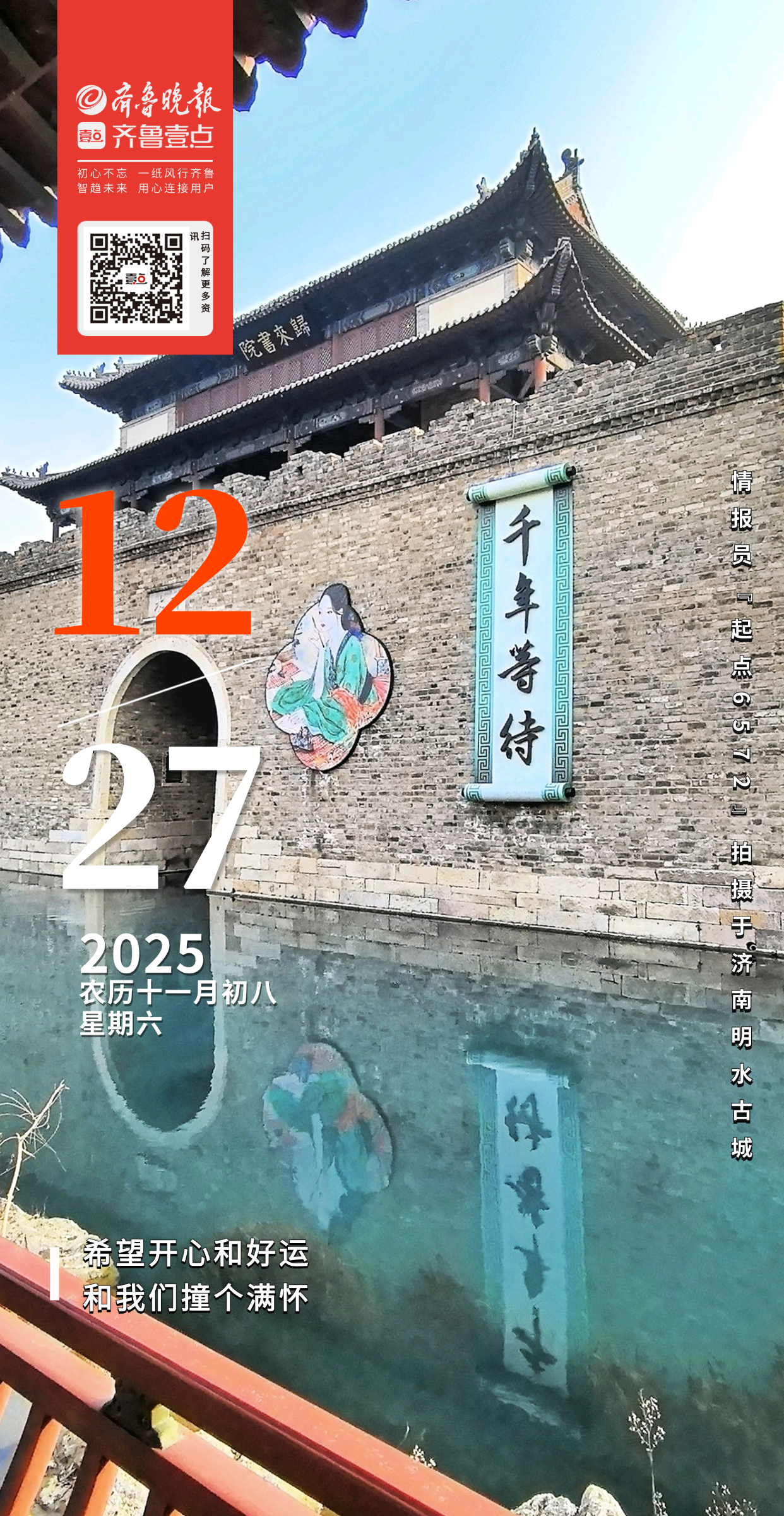 冬日明水古城,宛如一幅水墨画卷。青砖老墙与澄澈泉水相映,千年楹联随风轻晃。李清照剪影嵌于墙隅,晕染宋韵。佛塔临水,倒影层叠;乌篷船静泊岸边,褪绿柳枝添了几分清寂诗意,令人沉醉不已。