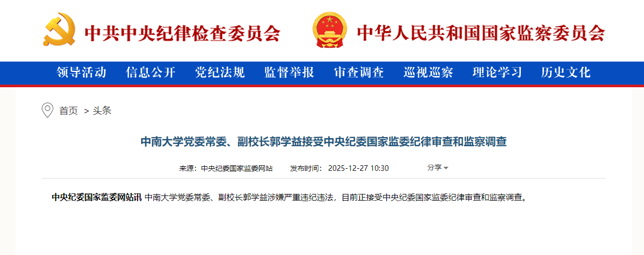 12月27日,中央纪委国家监委网站发布消息,中南大学党委常委、副校长郭学益涉嫌严重违纪违法,目前正接受中央纪委国家监委纪律审查和监察调查。