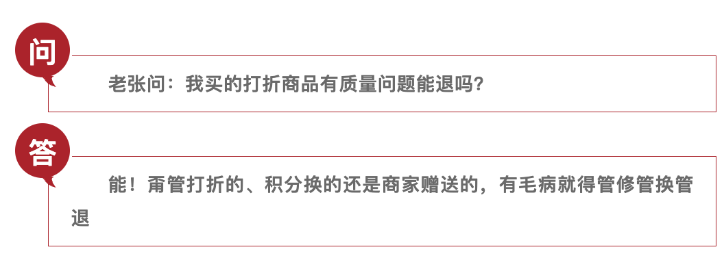 记住了:不管是打折货、积分换的、白送的,只要东西有毛病,商家就得管!“打折不退”是霸王条款,没理!遇上商家耍赖?别怕:先跟他讲理摆法,不行就投诉,再不行,法院见!