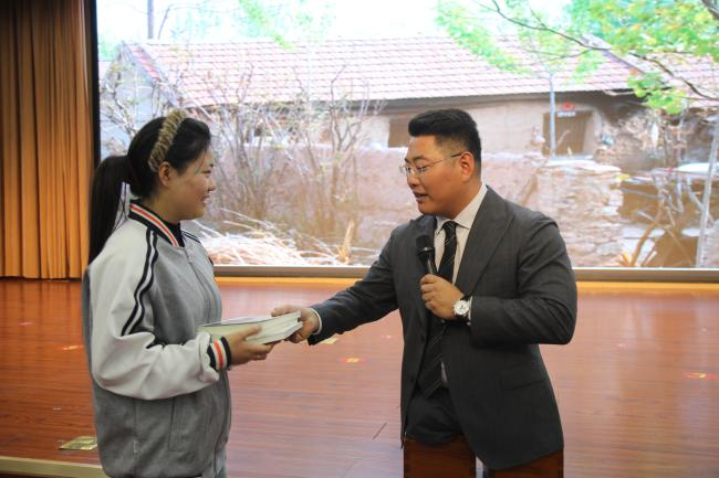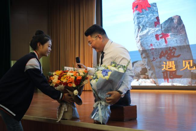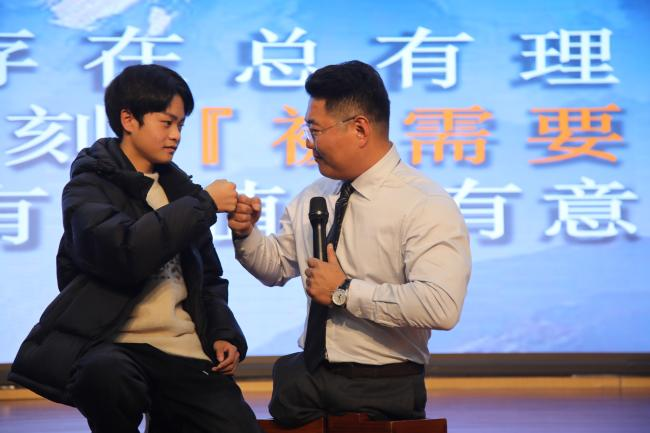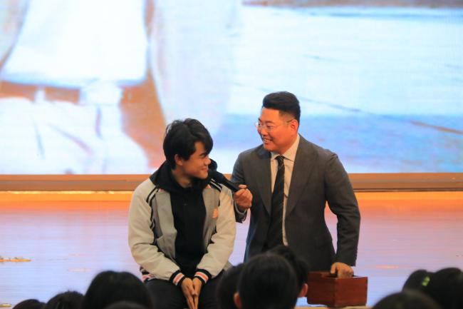 活动现场,互动环节精彩纷呈,气氛热烈。陈州与学生们亲切交流,温暖的拥抱、有力的碰拳,传递着无尽的力量与鼓励;他们一同合唱经典歌曲《水手》,激昂的歌声在会场内回荡,唱出了对生活的热爱与不屈;还开展了俯卧撑友谊比拼,陈州用行动诠释着坚韧与拼搏,让学生们深受鼓舞;此外,陈州还为学生们赠送了亲笔签名书籍,将这份励志的精神财富传递到学生手中,将现场气氛一次次推向高潮。活动尾声,学生代表手捧鲜花,满怀敬意地走向舞台,向陈州致以最崇高的敬意。