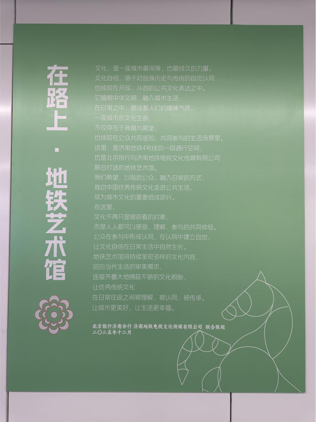 这是北京银行济南分行与济南地铁电视文化传媒有限公司联合打造的公共文化展示空间。不同于传统美术馆,这里的展览直接嵌入通行与换乘动线,让乘客在等车、换乘、出站的片刻之间,完成一次“顺路看展”的文化体验。