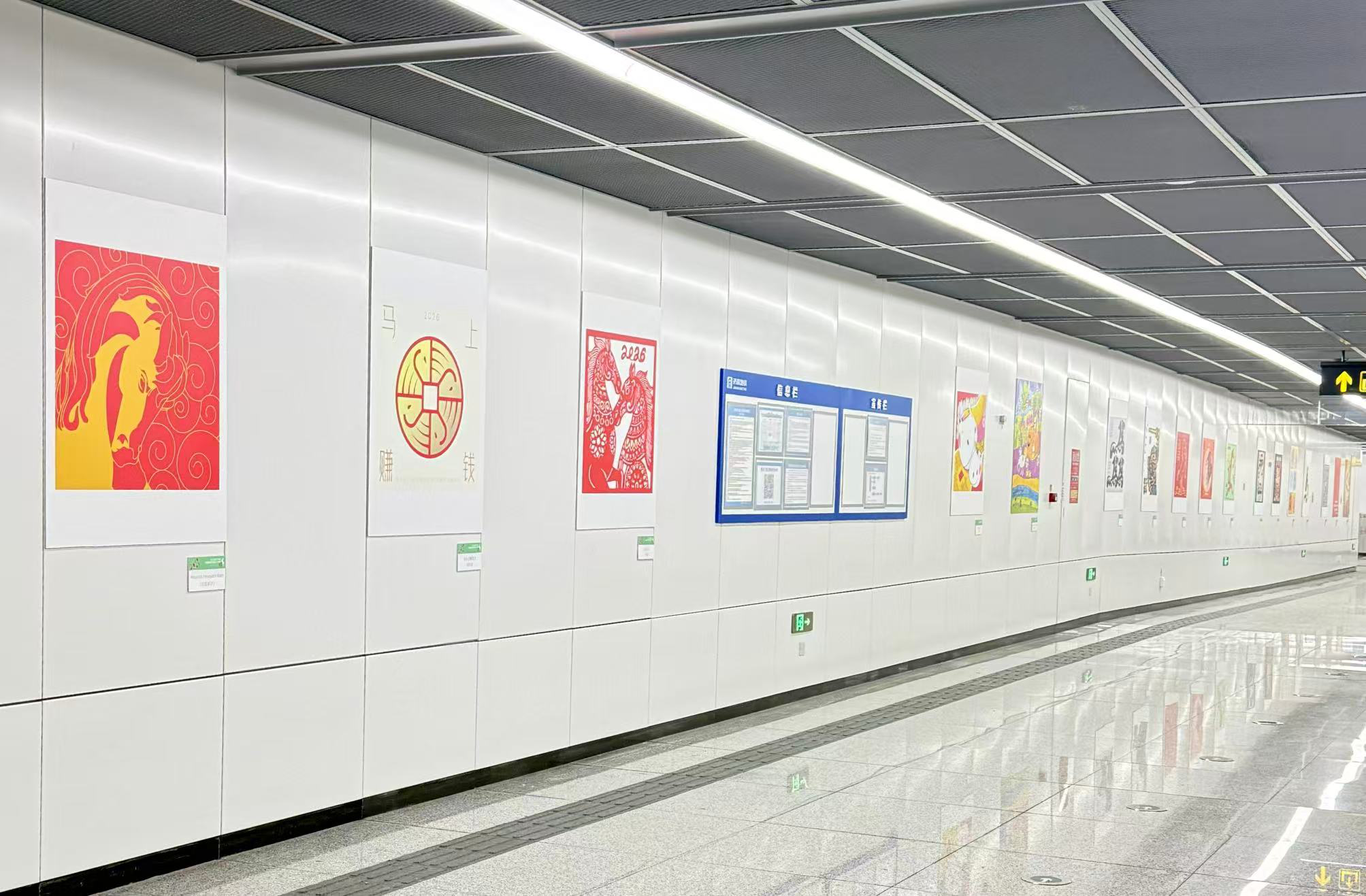 随着4号线开通,由北京银行济南分行联合济南地铁电视文化传媒有限公司打造的“在路上·地铁艺术馆”在山东省博物馆站和第一医科大学站同步亮相。展览以生肖马为主题,精选呈现“2026丙午马年中国高校生肖设计大赛”的部分入选、获奖及特邀作品。这些作品出自全国高校设计专业师生之手,涵盖海报设计、文创产品、字体设计、插画、动态影像及AI设计等多种形式。