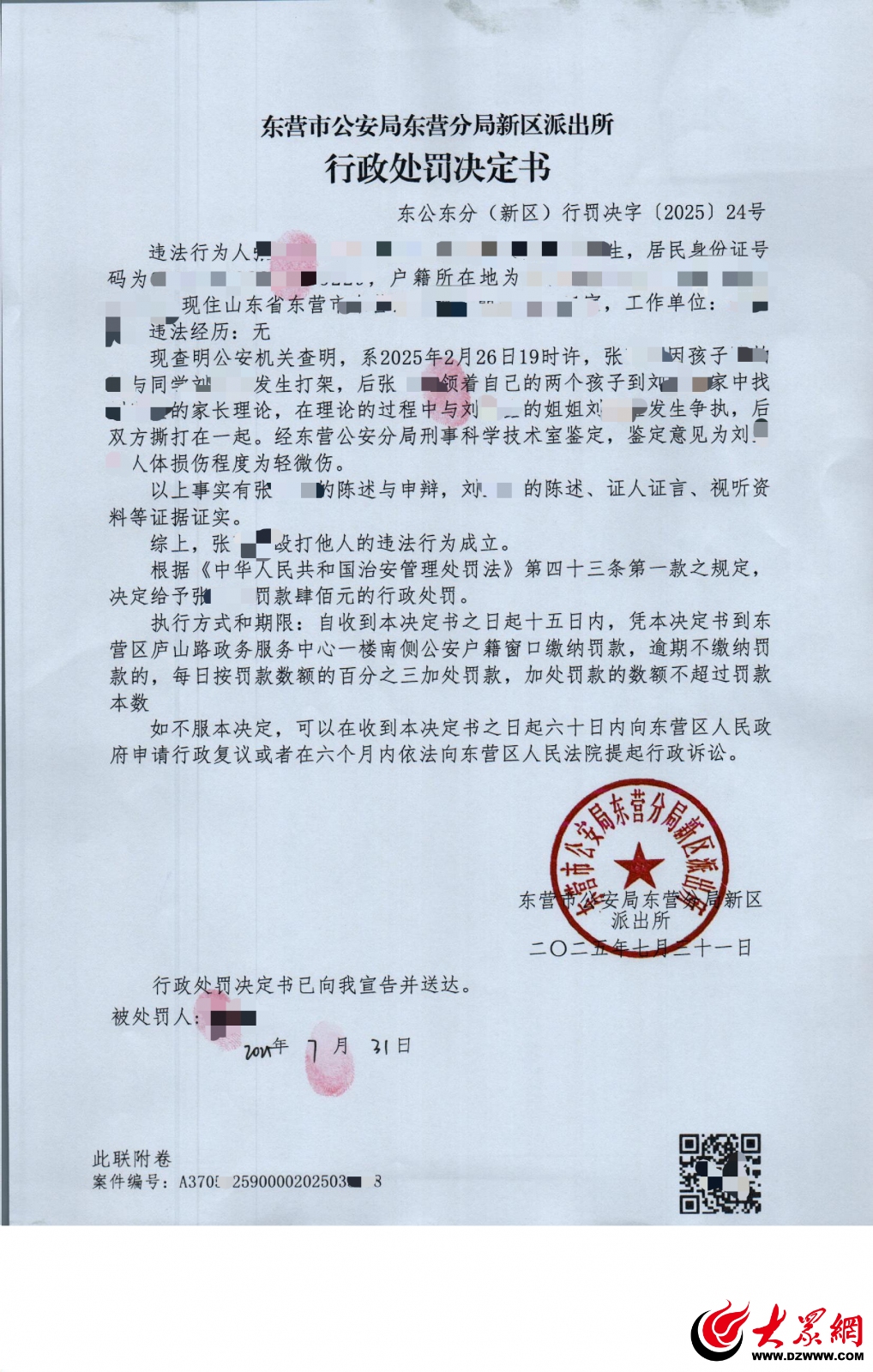 警方接警后,多次组织调解未果。由于事发在住户家门口,无监控记录过程,公安机关依据双方陈述、证人证言及张女士提供的现场录音等证据,认定双方均存在殴打他人的违法行为。2025年7月,东营市公安局东营分局新区派出所出具行政处罚决定书,依照《中华人民共和国治安管理处罚法》,对刘女士罚款200元,对张女士罚款400元。
