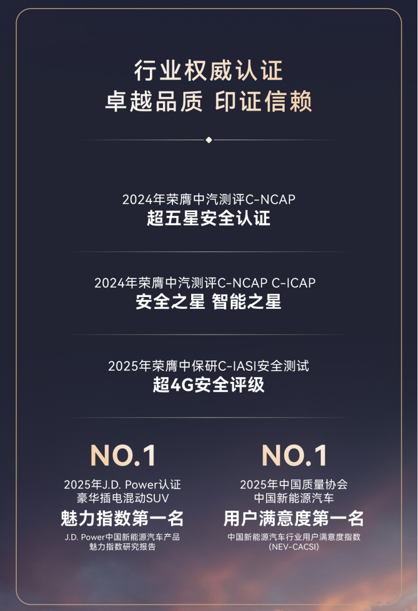 两年来,问界M9不仅赢得了市场,更获得了用户的高度认可。在杰兰路2024下半年-2025上半年新能源汽车品牌健康度研究中,问界M9连续两期获得新能源全车型用户净推荐值第一。此外,在中国质量协会发布的2025年中国新能源汽车行业用户满意度指数评测结果中,问界M9荣获第一名,在J.D. Power 魅力指数榜单中位列豪华插电混动SUV第一……这一系列殊荣,共同印证了这款现象级产品在新能源豪华车市场的领先实力,展现独特的标杆魅力。