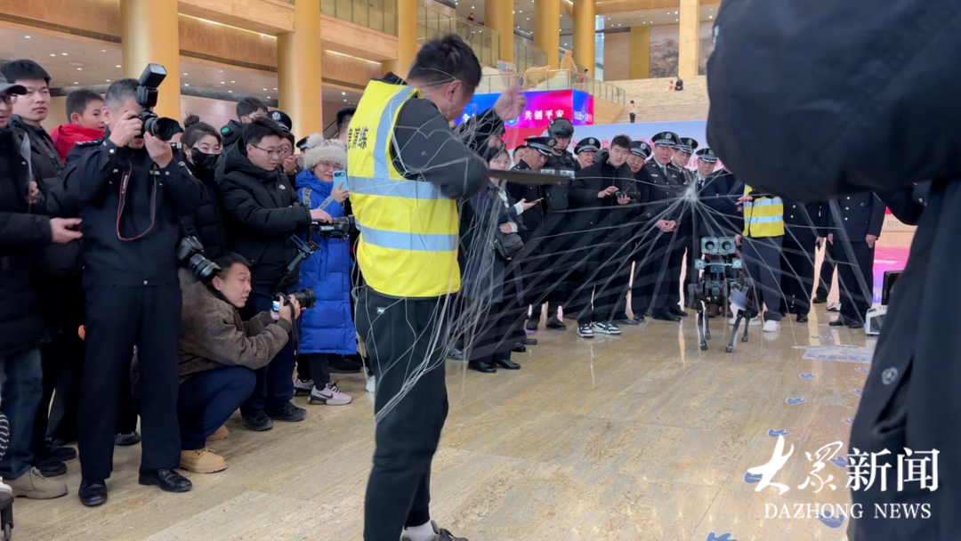 反恐演练现场,一名持刀的演练人员走向一台形似“机器狗”的设备,“机器狗”瞬间发射抓捕网将其缚住。工作人员介绍,这是他们新研发的反制系统,当识别到持有攻击性器械的可疑危险分子时,反制系统可发射抓捕网令其就范。