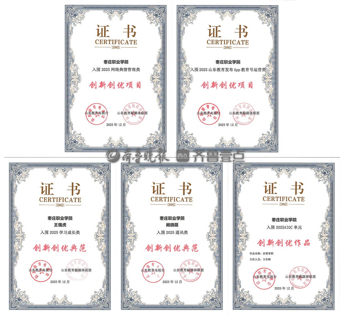本次评选中,枣庄职业学院入围“2025网络舆情管理类创新创优项目”“2025山东教育发布App教育号运营类创新创优项目”;王乐韬同志的作品《冰雪枣职》入围“2025 AIGC单元创新创优作品”;王慎虎、阚晓萌两位教师分别荣获“学习成长类”“通讯类”创新创优典范奖。这也是继“枣职融媒”获评2025年度“好网民·在枣庄”正能量社团后,枣庄职业学院在融媒体品牌建设与内容创新方面取得的又一重要成果。