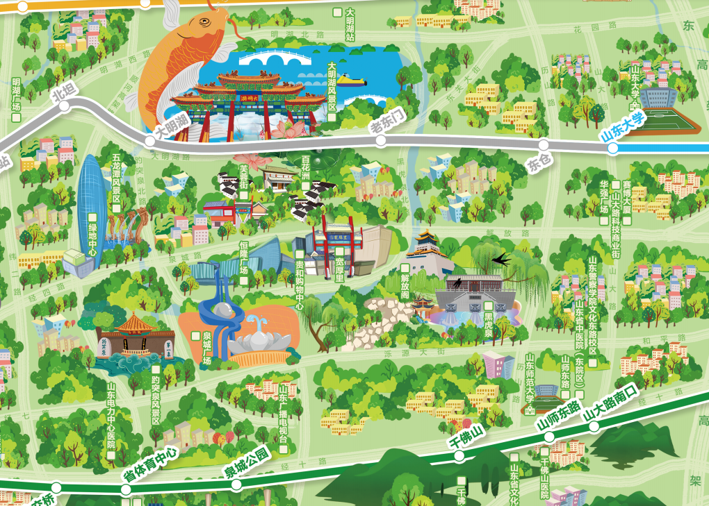 这份由济南轨道交通集团和山东数字文化集团联合制作的《济南轨道交通2025生活服务地图》,标注了目前济南轨道交通所有建成线路,包括已经开通的1、2、3、4、6、8号线,济南云巴以及还未正式开通的济阳线。在纵横交错的线网之间,则是泉城的众多景点、商超、学校、医院等标志性建筑。由于采用的是手绘卡通风,画面呈现效果也是“萌点十足”——比如位于老城区的大明湖,一条金色鲤鱼跃出水面;在七里堡站旁,展现的是高耸入云的洪家楼教堂;空中行驶的济南云巴被祥云环绕……同时,图上也清楚地标明了各条线的车站、换乘车站以及周边的配套等服务信息,让出行的市民真正实现了“一图在手,出行无忧”!