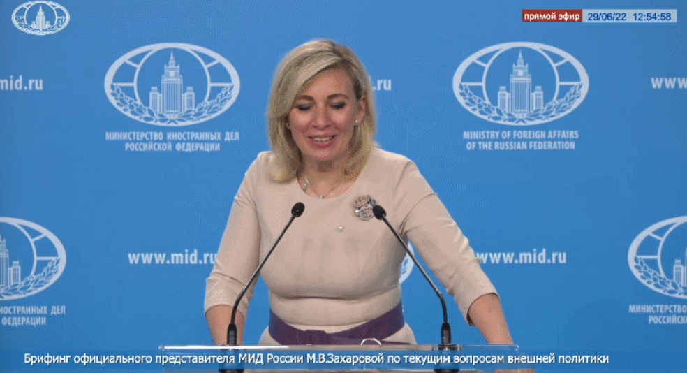 2022年的一场发布会上,对于英国高官声称为了证明“俄罗斯从乌克兰偷粮食”,要对这些粮食进行DNA检测溯源的说法,扎哈罗娃先是爆笑,接着嘲讽称,“英国会对小麦进行审讯吗?我认为这么做很有必要:记录下小麦的口供,传唤目击证人,再安排小麦和小麦对质,当然最后要进行基因鉴定,想必这样还能找到它们更多‘失踪的亲戚’。”