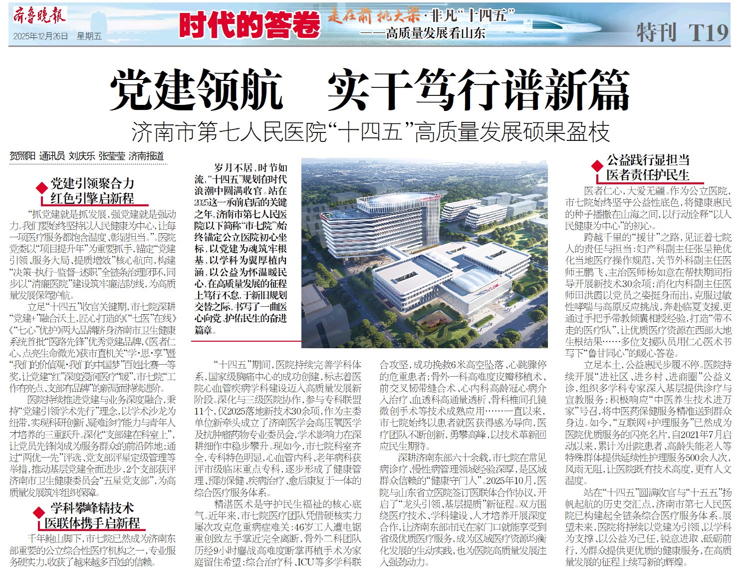 岁月不居,时节如流,“十四五”规划在时代浪潮中圆满收官。站在2025这一承前启后的关键之年,济南市第七人民医院(以下简称“市七院”)始终锚定公立医院初心坐标,以党建为魂筑牢根基,以学科为翼厚植内涵,以公益为怀温暖民心,在高质量发展的征程上笃行不怠,于新旧规划交替之际,书写了一曲医心向党、护佑民生的奋进篇章。