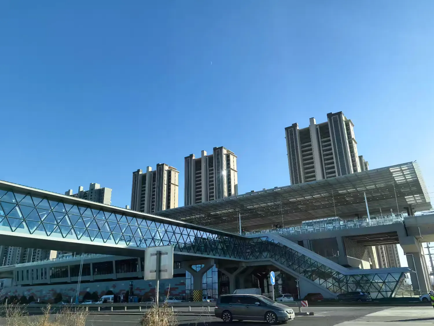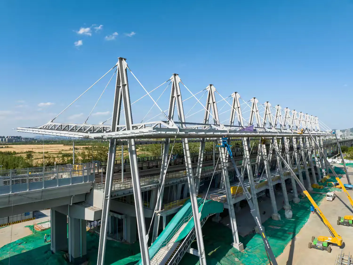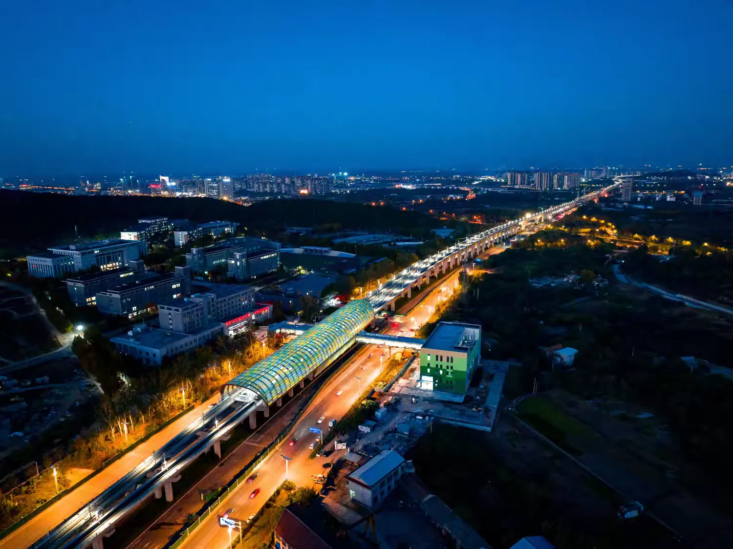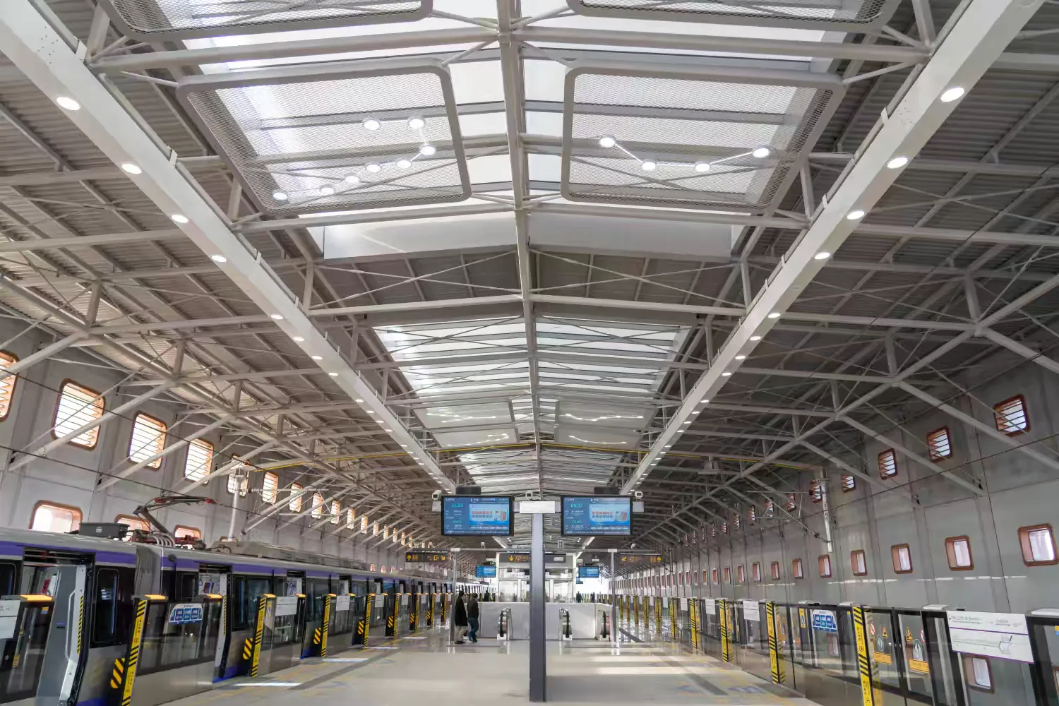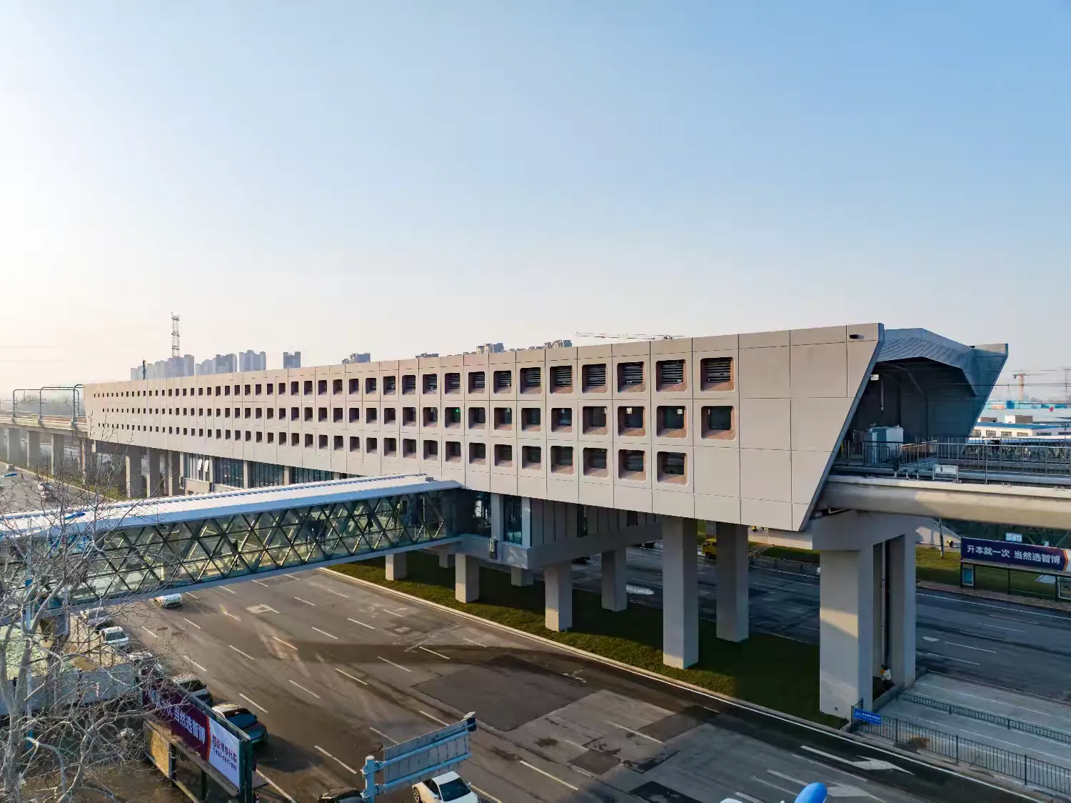 车站雨棚为悬挑形式,是全线高架车站雨棚钢结构中最复杂的一座。车站采用建筑光伏一体化设计,光伏玻璃兼做车站雨棚,预计年发电量约18万千瓦时,可满足车站部分用电需求,还配备雨水回收系统,搭配智慧运维系统,具有节能、节水、节材、安全舒适、智慧运行等特点,助力乘客出行更安全、乘车更顺畅、环境更舒适。