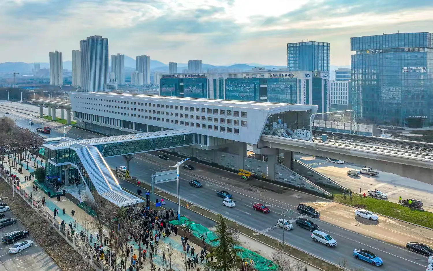 章丘圣井立交桥西南侧的山大龙山站,则采用“站城一体”设计理念,与未来商业开发相结合,是一次TOD新模式的有力探索。