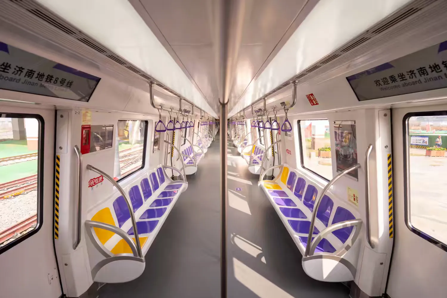 座椅则是由圣泉集团生产的酚醛玻璃钢制成,4号线为“青山绿”,6号线为“泉之蓝”,8号线为“科创紫”,充分考虑人体工程学,各座位间都有流线造型,使乘客乘坐时贴合感更强,增加了乘坐舒适性。