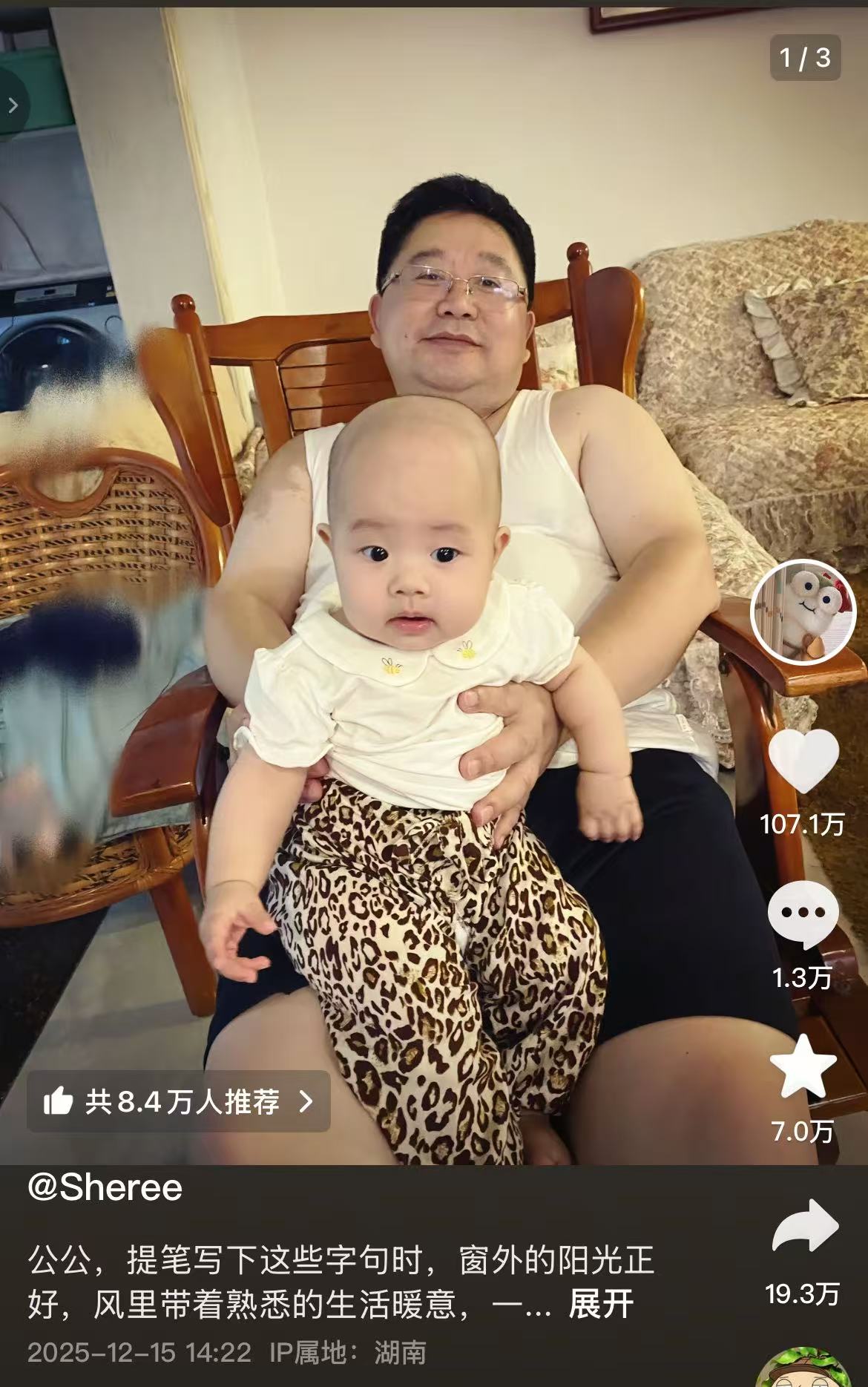 “总记得家里转角的那张沙发,是您最常停留的地方。您总爱躺在那里歇一歇,均匀的鼾声一点也不均匀且声音很大,但是却成了家里最安稳的背景音。”儿媳写道。刘一周不善言辞,却有着最憨厚的笑容,眉眼弯起时满是暖意,见着家人,那份温柔便藏不住地溢出来。