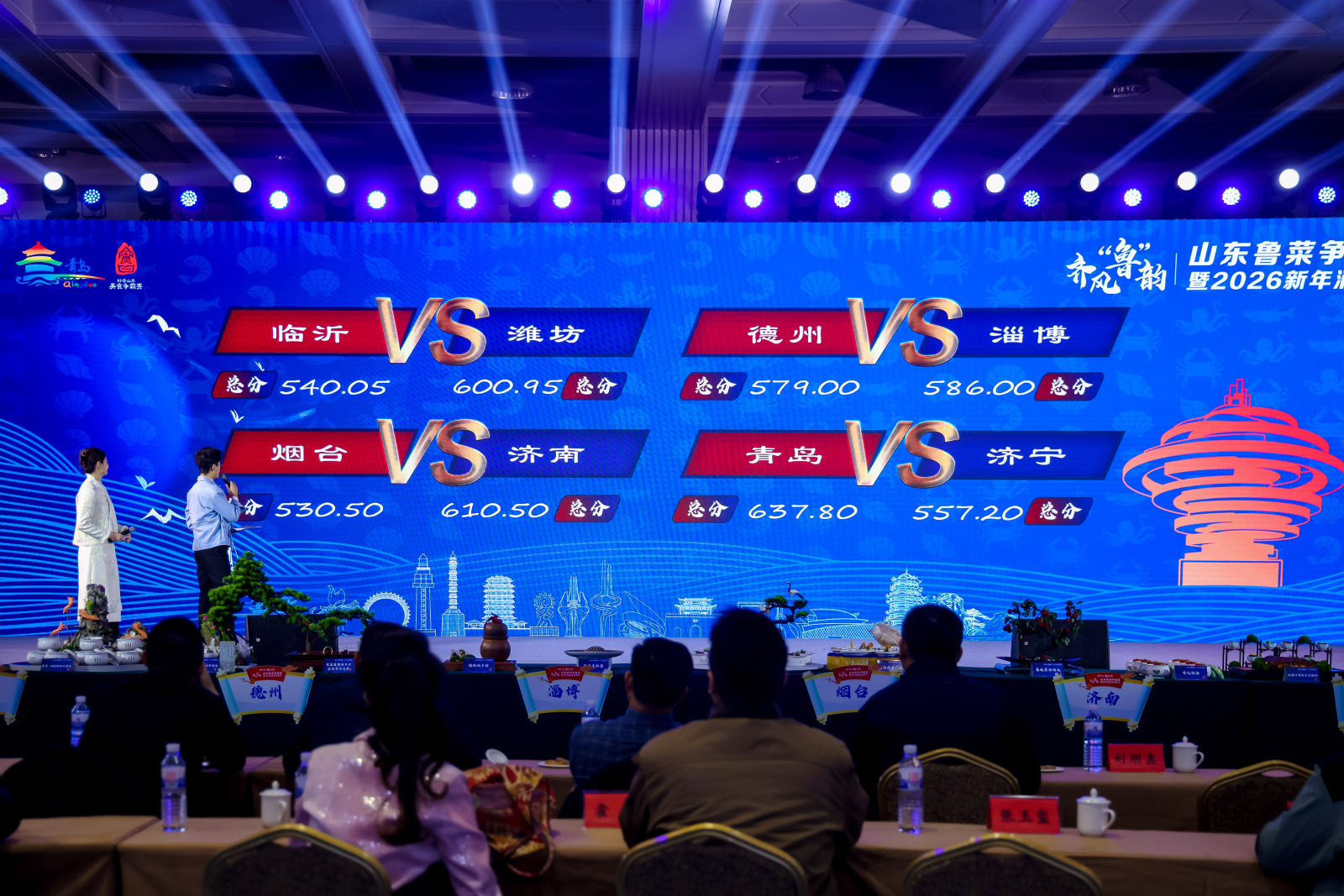 下午4时,八强赛准时拉开帷幕。青岛队凭借“里岔黑猪”“海捕大虾”两种风味,打造“焦溜汁㸆里岔黑猪排”“富贵牡丹虾配金汤海胆汁”,演绎青岛“山海相逢”的独特魅力;济南队巧用“鲜肉”“菌菇”“雪梨”“银杏”,烹出“荔枝罐汤肉丸”“诗礼银杏”两道佳肴,尽显济南“泉城雅韵”的别致底蕴;淄博队甄选“羊肚菌”“散养黑猪肉”,烹制“翰林坛子肉”“沤底羊肚菌”两款名菜,诠释淄博“齐地风味”的醇厚底蕴;潍坊队妙用“鸡腿”“海螺”“蹄筋”等食材,打造“鲁宴·九转玲珑山海肉”“板桥八宝糊涂鸡”,彰显潍坊“鸢都食萃”的别样风采。四方名厨各展所长,将山东各地的饮食文化与风土人情,尽数融于一席珍馐之中。最终,济南、青岛、淄博、潍坊四支队伍晋级决赛,临沂、德州、烟台、济宁获得“优秀菜品奖”。