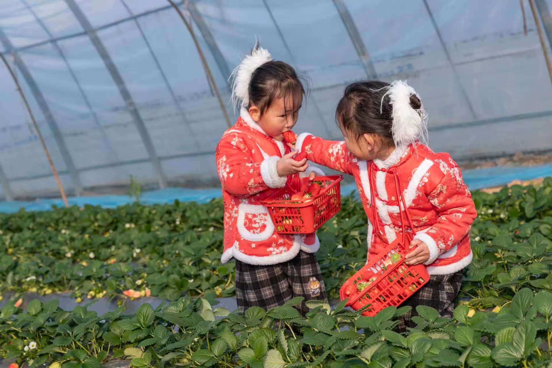 核心采摘区里,标准化大棚整齐排列,推门便是浓郁果香。粉色诱惑、香野、天仙醉等优质草莓挂满藤蔓,色泽鲜亮、饱满诱人。游客们携家带口或约上好友,手提采摘篮穿梭田垄间;孩子们摘下草莓便迫不及待品尝,甜香让笑容绽放。大棚内外,笑声与快门声交织,定格“莓好时光”。棚外40余个摊位组成的特色市集人气爆棚,新鲜草莓及草莓酸奶、果酱、果干等深加工产品,搭配草编、剪纸等非遗手造,满足游客一站式采购需求。舞台上,舞蹈、渔鼓等接地气的文艺节目轮番上演,非遗与乡村场景相融获阵阵掌声;两人三足、投壶掷盘等互动游戏吸引各年龄段游客,现场氛围持续升温。
