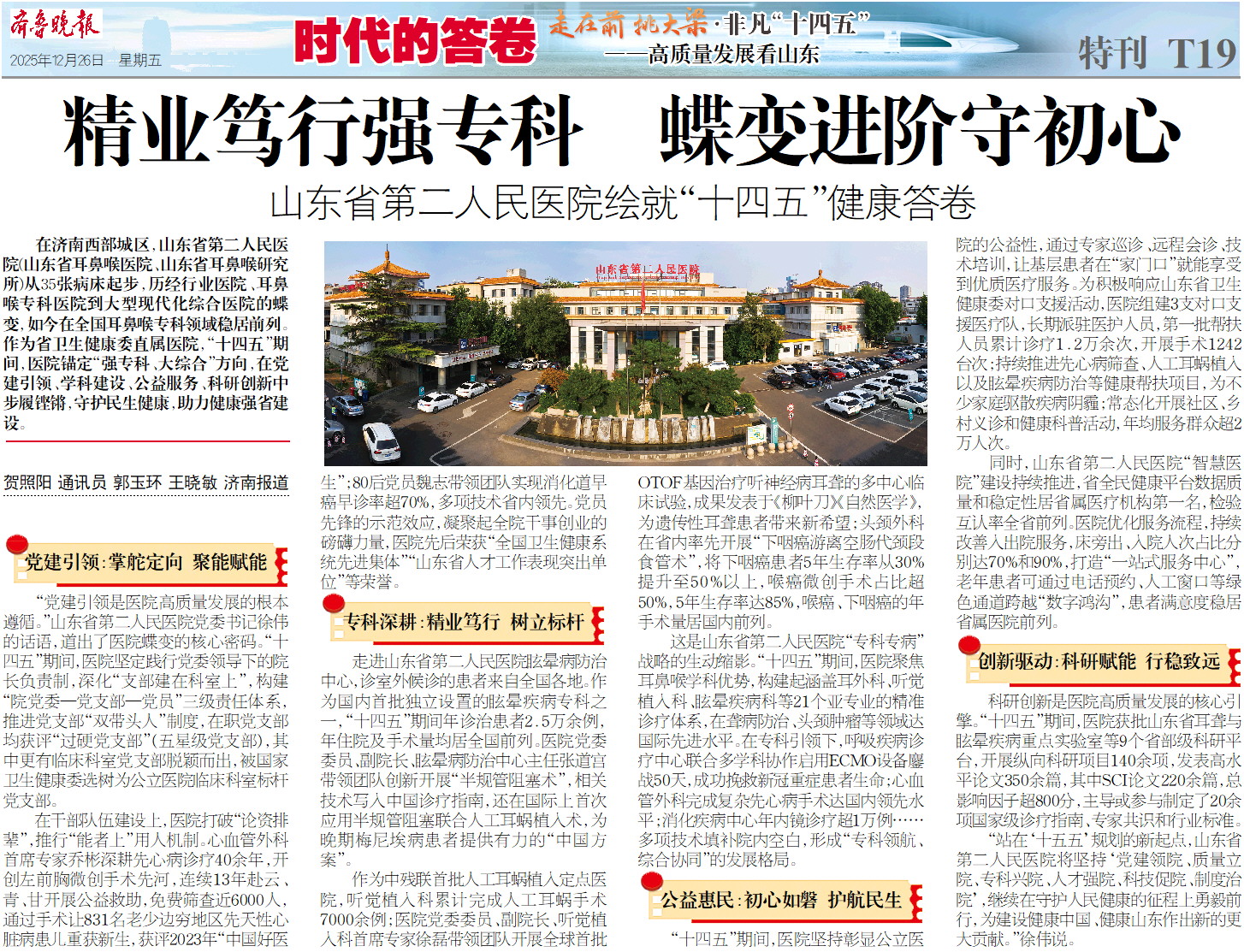 在济南西部城区,山东省第二人民医院(山东省耳鼻喉医院、山东省耳鼻喉研究所)从35张病床起步,历经行业医院、耳鼻喉专科医院到大型现代化综合医院的蝶变,如今在全国耳鼻喉专科领域稳居前列。作为省卫生健康委直属医院,“十四五”期间,医院锚定“强专科、大综合”方向,在党建引领、学科建设、公益服务、科研创新中步履铿锵,守护民生健康,助力健康强省建设。